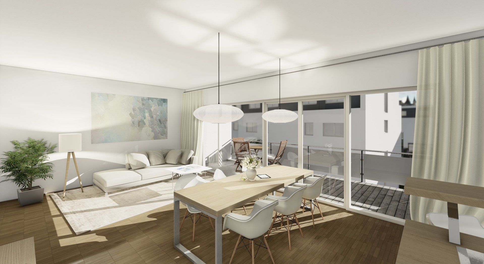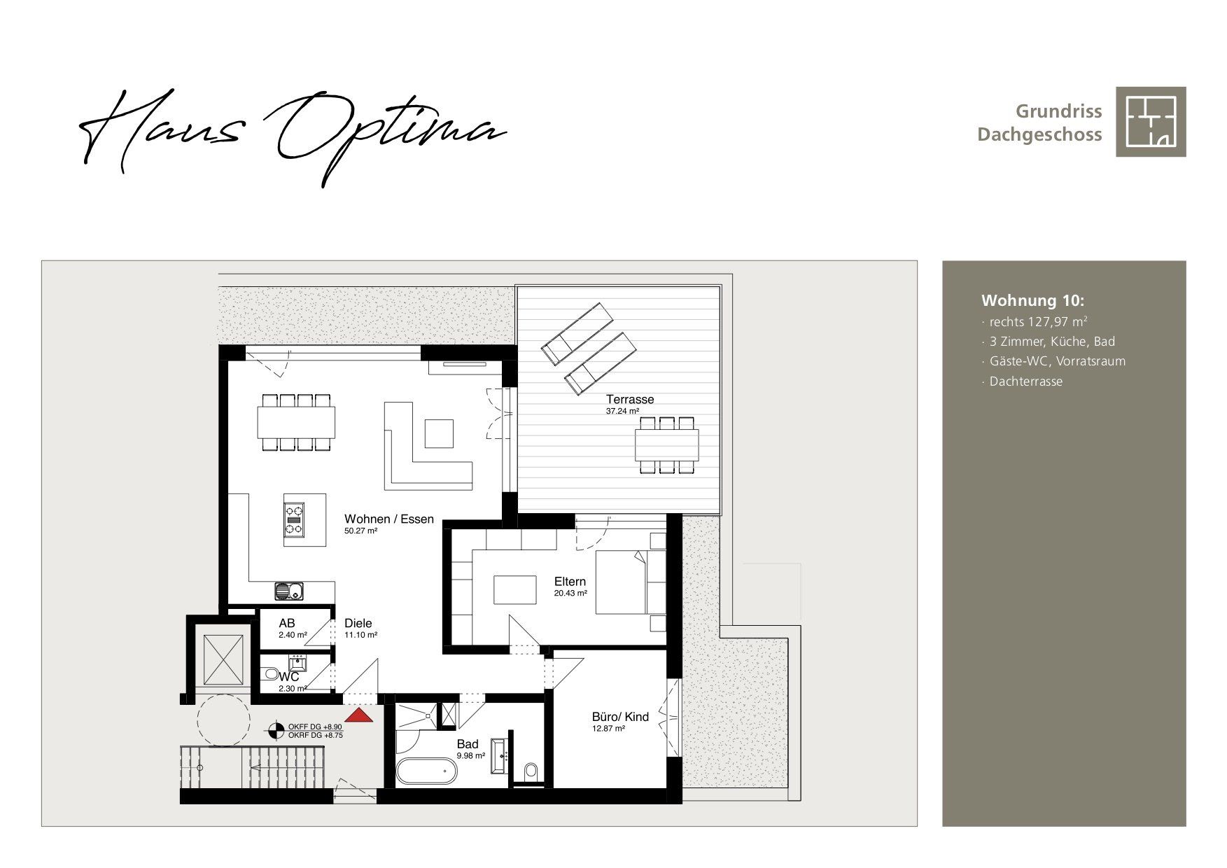 Das Dachgeschoss beherbergt zwei exklusive 3 Zimmer-Penthouse-Wohnungen mit großzügiger Dachterrasse. Die Wohnung 9 (links zum Bach) ist reserviert.